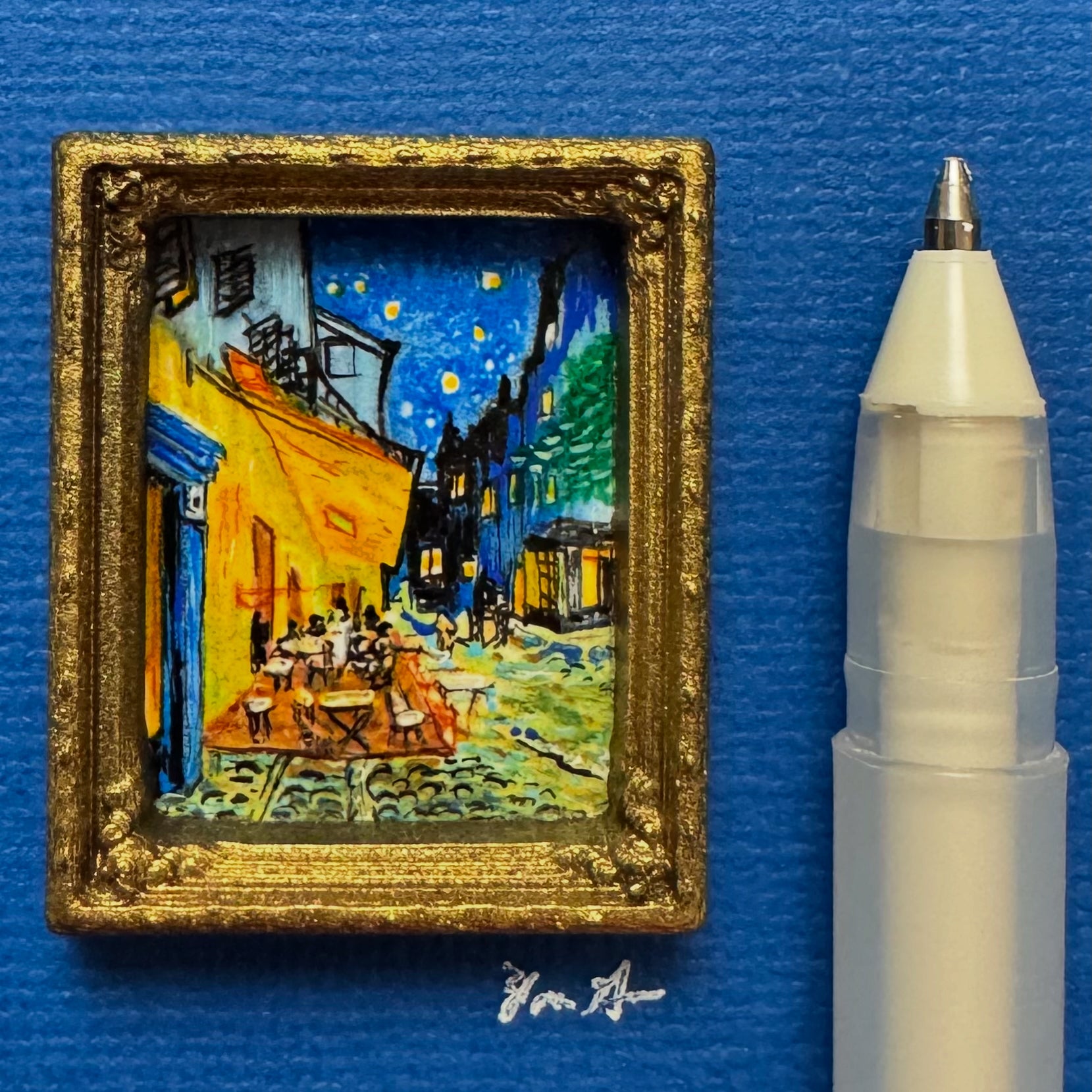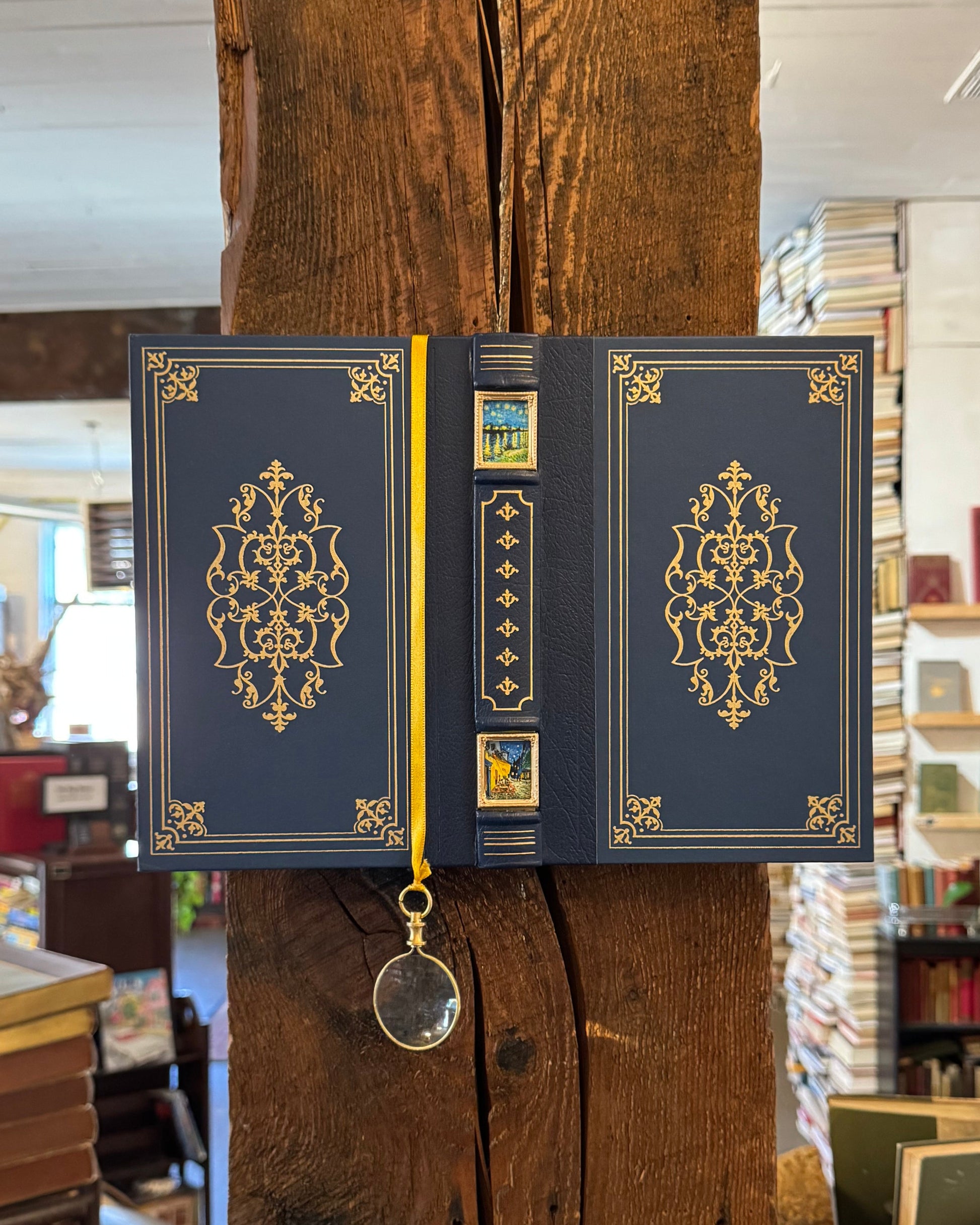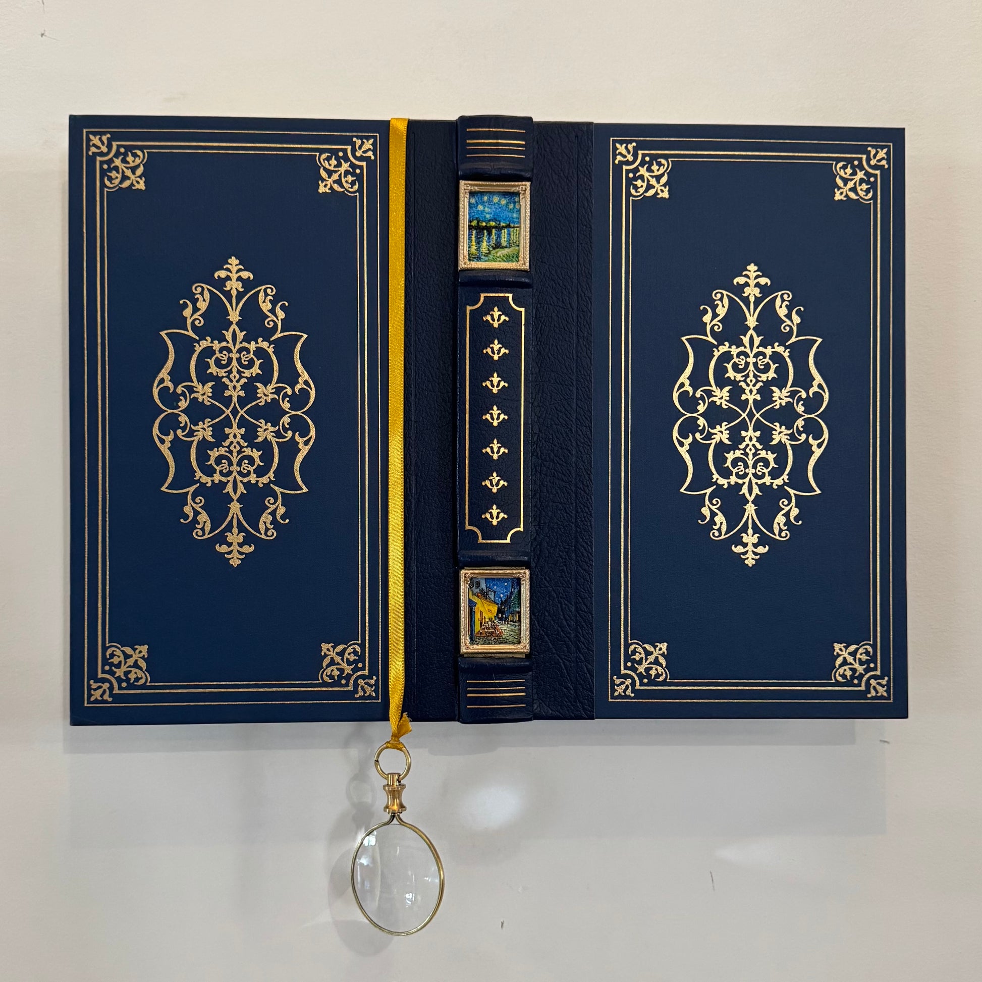 This miniature artwork reimagines a leather-bound copy of John Milton's Paradise Lost by carving niches into its spine, revealing two delicate pen-and-pencil drawings of Van Gogh’s masterpieces: Starry Night Over the Rhône and Café Terrace at Night. These luminous night scenes—swirling stars above the river and warm café lights piercing the dark—mirror Milton’s epic exploration of light and shadow, heaven and earth. Through this fusion, the book becomes a portal, blending literature and visual art to suggest that even in loss, beauty and redemption shine through. Peek inside to uncover the hidden dialogue between these timeless works.